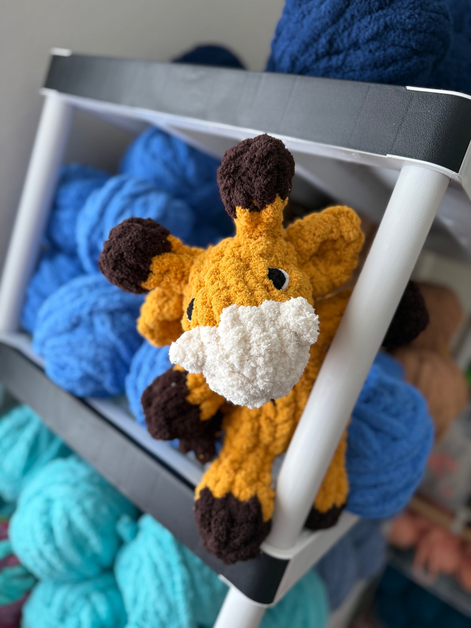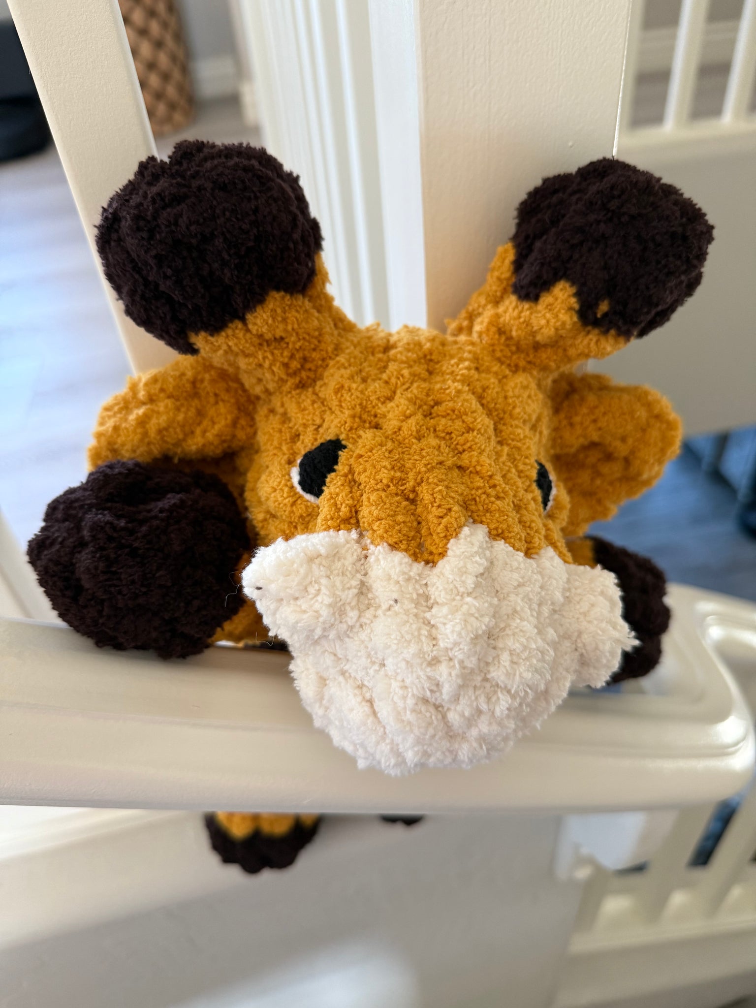 Meet Gigi Giraffe! She’s full of personality and ready to bring coziness to whomever receives her.  (Gigi is NOT just for kids, she loves adults too!). She measures roughly 13 inches tall and has no stuffing in her body to make her extra cuddly!  You can choose the main head/body color and accent color (ears, spot, hooves). Â